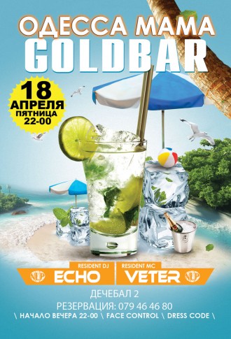 Добро пожаловать в Одессу в ночном клубе Goldbar. Стройные длинноногие морячки будут сопровождать вас в увлекательном морском круизе. Капитан корабля DJ Echo приготовил особенный DJ-сет, так что музыкальный шторм супернастроения вам обеспечен. Главным сюрпризом вечера станет шоу специального гостя Патрика. Приготовьтесь также к сильной качке с МС Veter. Встречайте солнце, ловите море, зажигайте улыбки на вечеринке "Одесса Мама". Резервация по телефону 079464680.